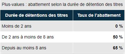 Quelques soit l’année d’acquisition des titres, un abattement complémentaire de 500 000 € est accordé aux dirigeants de PME qui vendent leur entreprise en raison d’un départ en retraite. Cet abattement n’est pas cumulable avec l’abattement de droit commun ou renforcé et ne concerne que les titres détenus depuis plus d’un an.